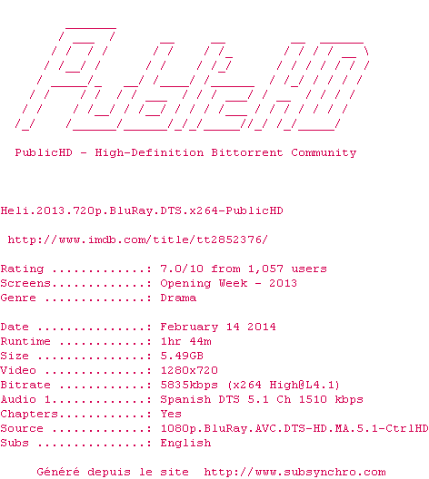 | Voir le nfo de la release Heli.2013.1080p.BluRay.DTS.x264-PublicHD | PublicHD | Heli.2013.1080p.BluRay.DTS.x264-PublicHD OpenSubtitles | 0 fichier |