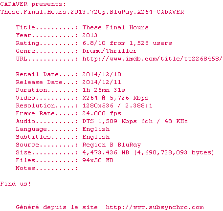 Voir le nfo de la release These.Final.Hours.2013.BDRip.X264-CADAVER