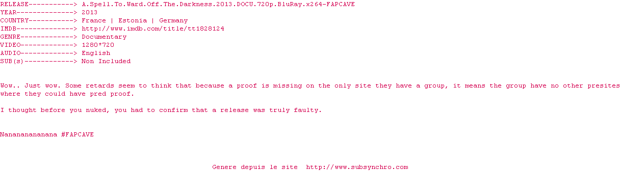 Voir le nfo de la release A.Spell.To.Ward.Off.The.Darkness.2013.DOCU.720p.BluRay.x264-FAPCAVE