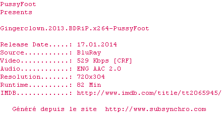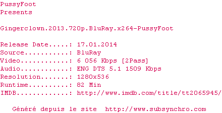 | Voir le nfo de la release Gingerclown.2013.BDRiP.x264-PussyFoot | PussyFoot | Gingerclown.2013.BDRiP.x264-PussyFoot OpenSubtitles | 0 fichier |