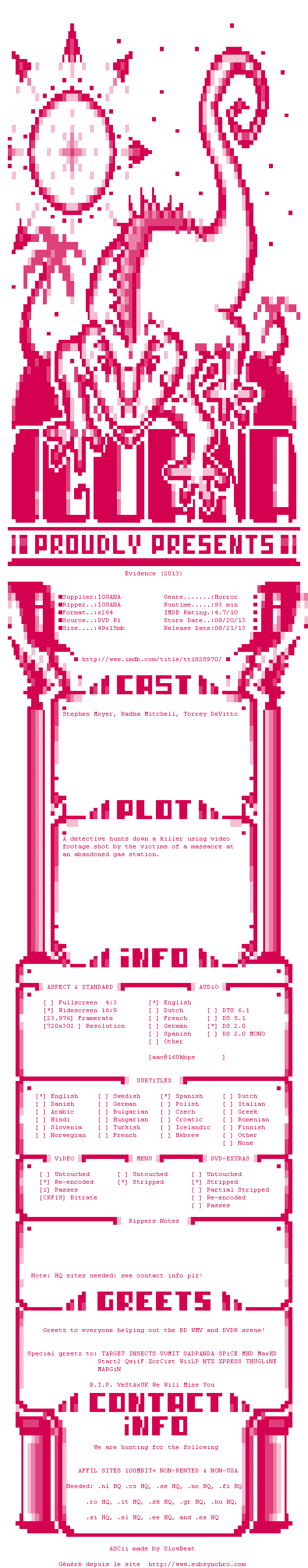 Voir le nfo de la release Evidence.2013.DVDRip.x264-IGUANA