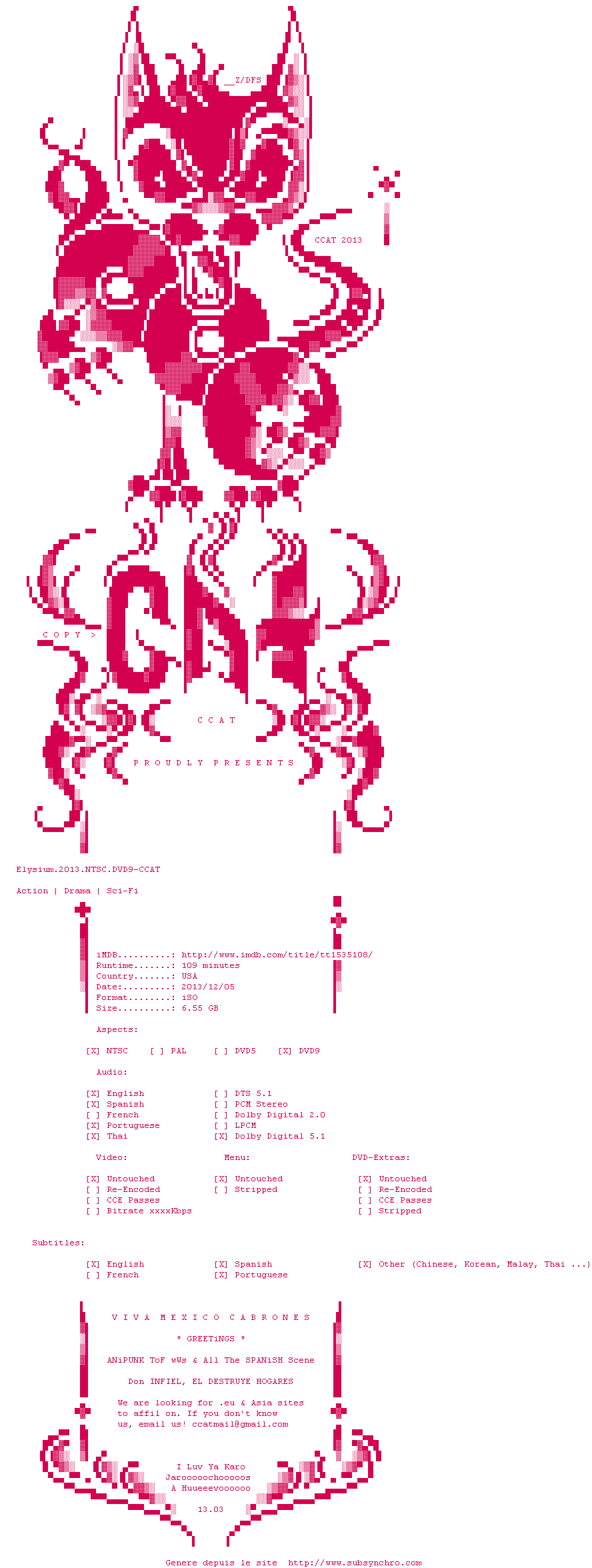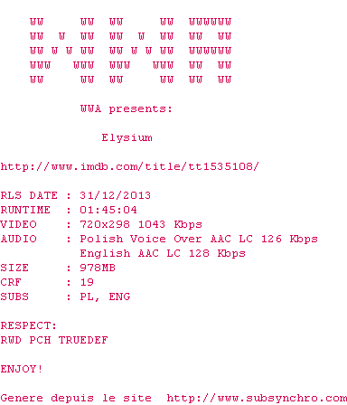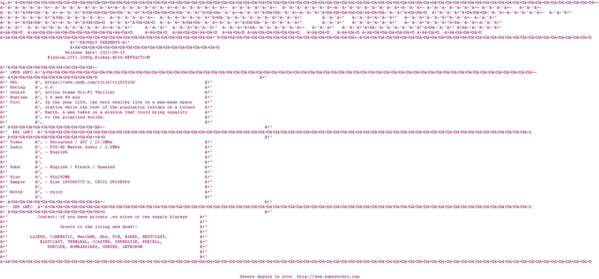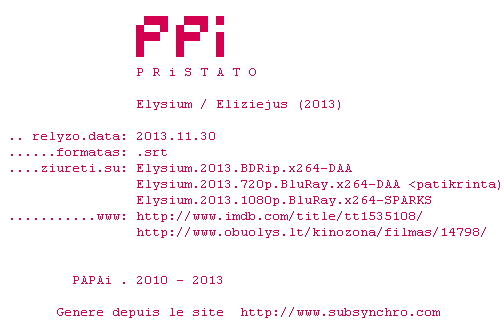 On est bien dans le visuel de District 9, de la sf bien crade. Par contre le côté série B qui donnait son caractère à District 9 est ici absent. Les deux point forts à mon avis sont la greffe à l&39;arrache de l&39;exosquelette de Matt Damon (c&39;est pas du spoil, on le voit sur l&39;affiche) et Sharlto Copley, le héro humain de district 9, ici le méchant mercenaire très convaincant. Super acteur. Le scénar est un standard de la sf, rien à chercher de ce côté.