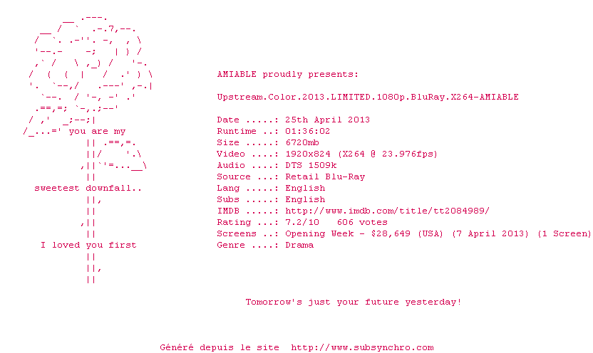 Voir le nfo de la release Upstream.Color.2013.LIMITED.RERIP.720p.BluRay.x264-AMIABLE