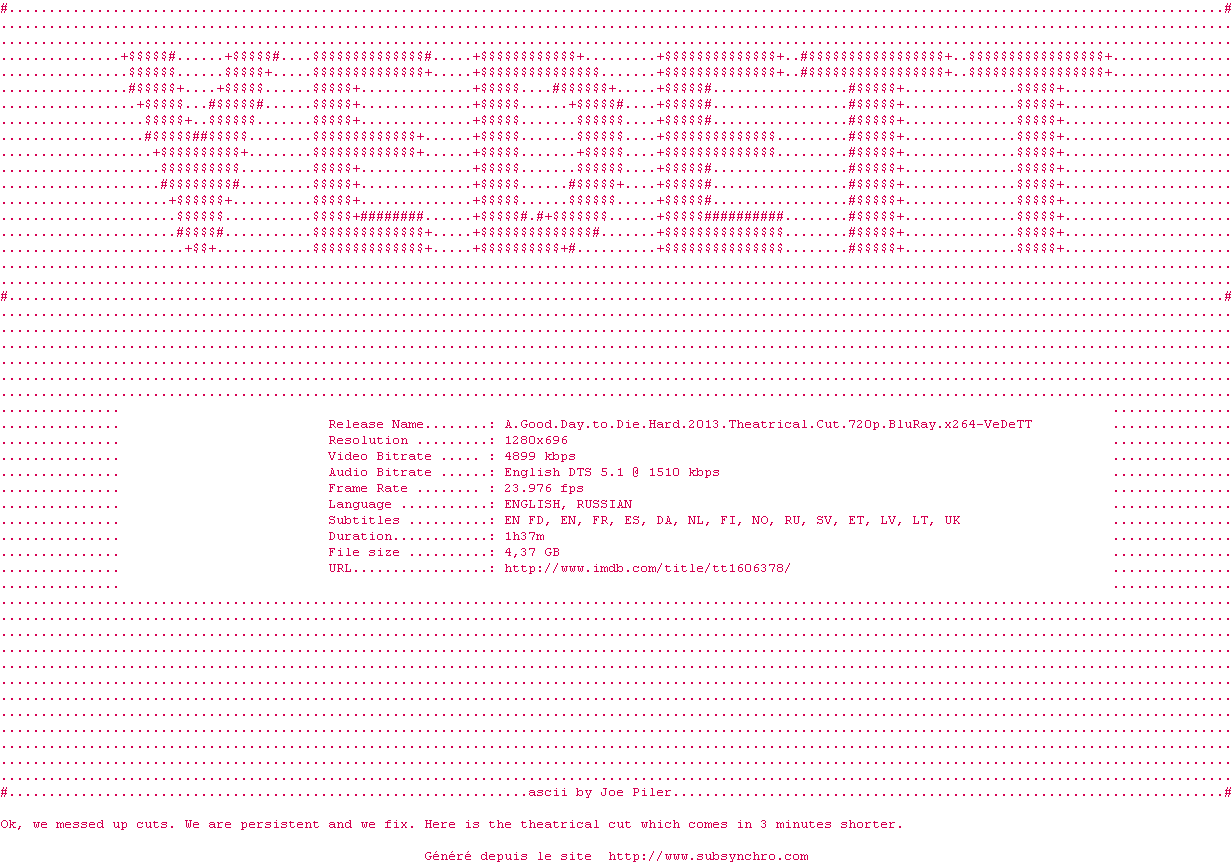 Ben, c'est un Die Hard, quoi... Tout le monde sait que depuis le premier, c'est pas top. DONC, comme je dis toujours, ne nous crispons pas et n'essayons pas de faire croire que l'on est trompé sur la marchandise, on sait exactement ce qu'on va voir. Le fiston (le méchant de Jack Reacher) fait bien le job, Bruce Willis a le mérite de ne pas essayer de faire jeune et finalement j'ai passé un bon moment. Bien sûr, ma critique serai plus saignante si j'avais payé ma place. A la maison c'est très bien...