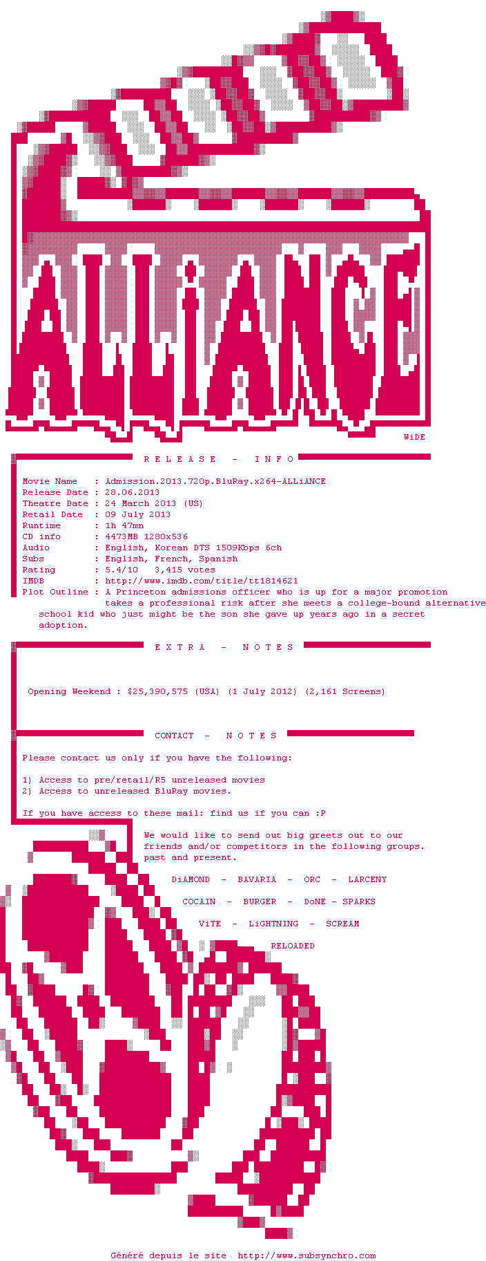 Voir le nfo de la release Admission.2013.1080p.BluRay.x264-ALLiANCE