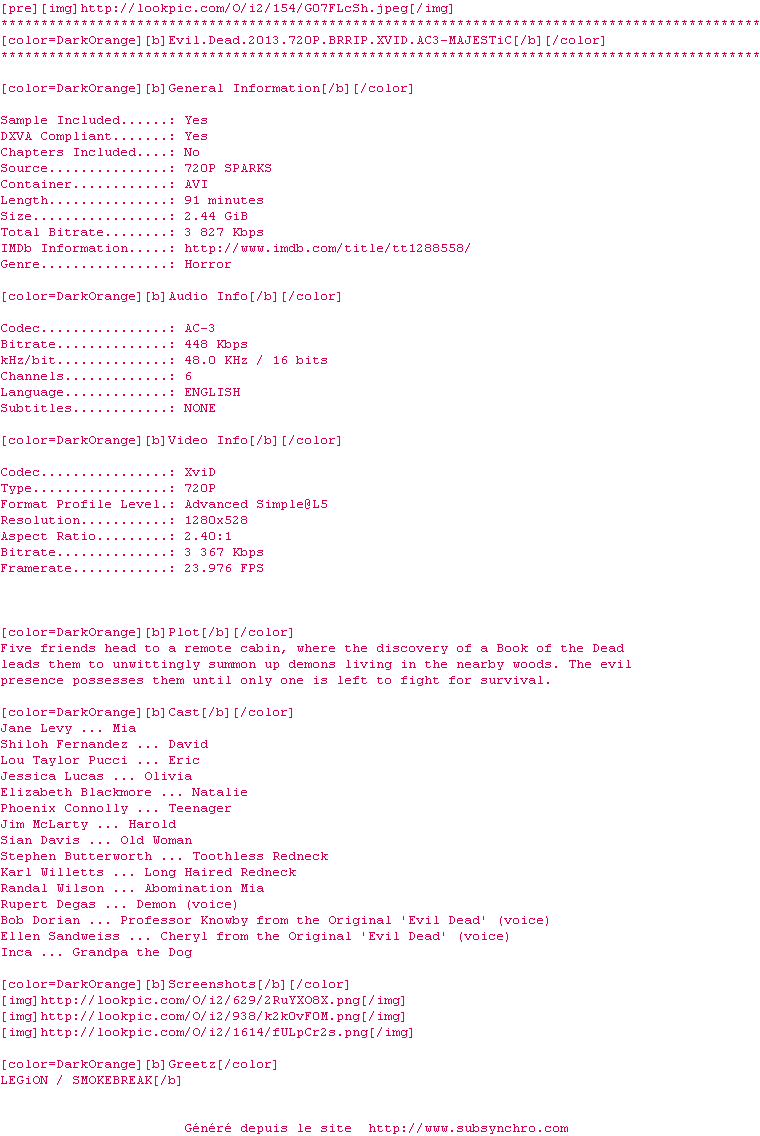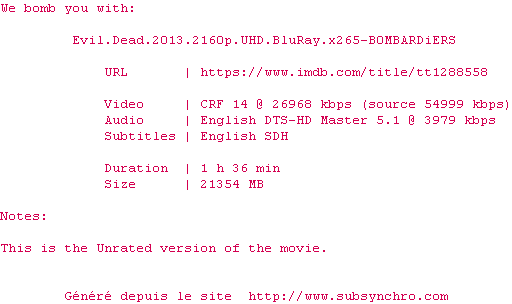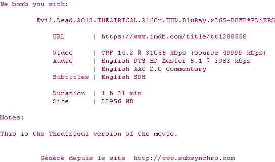 Sympa!! Cet "Evil Dead" n'a pas tellement grand chose à voir avec son aîné mais, il faut le dire, les sensations sont là. Peu de frissons, mais une ambiance oppressante réussie qui s'allie à merveille aux scènes particulièrement gores du film. Le sang coule à flot, et le tout est vraiment très convaincant.