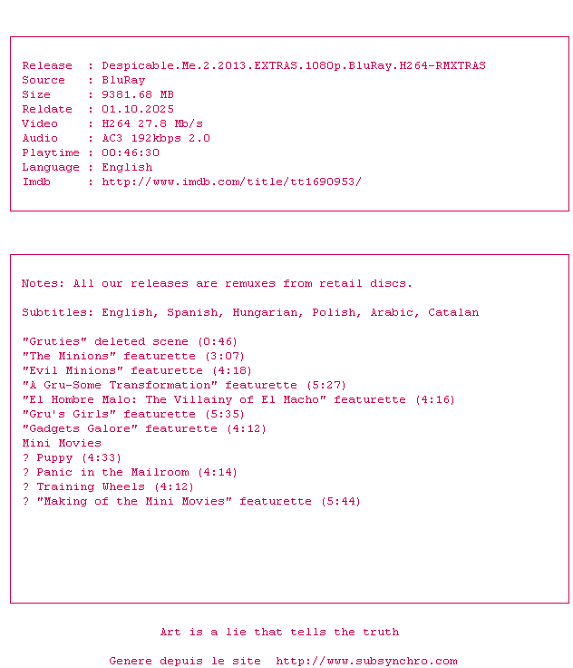 L'histoire n'a rien de très originale. Par rapport au premier, on a perdu le côté décalé du gentil/méchant, mais heureusement il y a les minions, vraiment hilarants ! Vivement le minions-movie en 2015