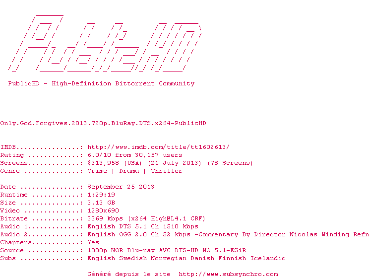 L'esthétique sublime des plans, la qualité de l'utilisation des sons, les bonnes performances d'acteurs de Ryan Gosling et de Kristin Scott Thomas, rarement aussi sexy et intense, tiennent de force un film au scénario bas de gamme, mort-vengeance, à la psychologie d'école, oedipe-inceste, à la vision bien tranchée de la thaïlande qu'on nous sert tout le temps au cinéma, prostitution-pédophilie, boxe, violence etc...