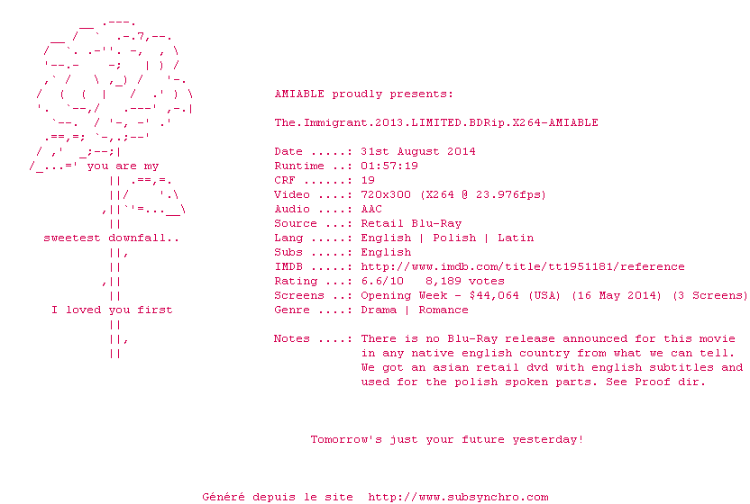 Voir le nfo de la release The.Immigrant.2013.LIMITED.BDRip.X264-AMIABLE