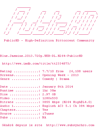 Le commentaire de Zorglubu Commente par Zorglubu (10), Le Samedi 18 Janvier 2014 à 10h47 Un très bon cru de W. Allen. en effet, un film plutôt sérieux sans trop d’humour potache qui laisse à réfléchir sur la déchéance morale et physique d'une "grosse" bourgeoise américaine au XXIeme siècle. Cate Blanchett est d'une justesse à couper le souffle. J'ai pas mis au dessus de 8,5 car le film manque lui (scénario, montage, ...) un petit peu de souffle. Ceci dit je mes suis pas ennuyé une seconde non plus. 8.5 / 10 1 0