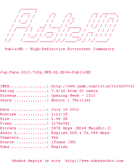 | Voir le nfo de la release Jug.Face.2013.720p.WEB-DL.H264-PublicHD | PublicHD | Jug.Face.2013.720p.WEB-DL.H264-PublicHD OpenSubtitles | 0 fichier |