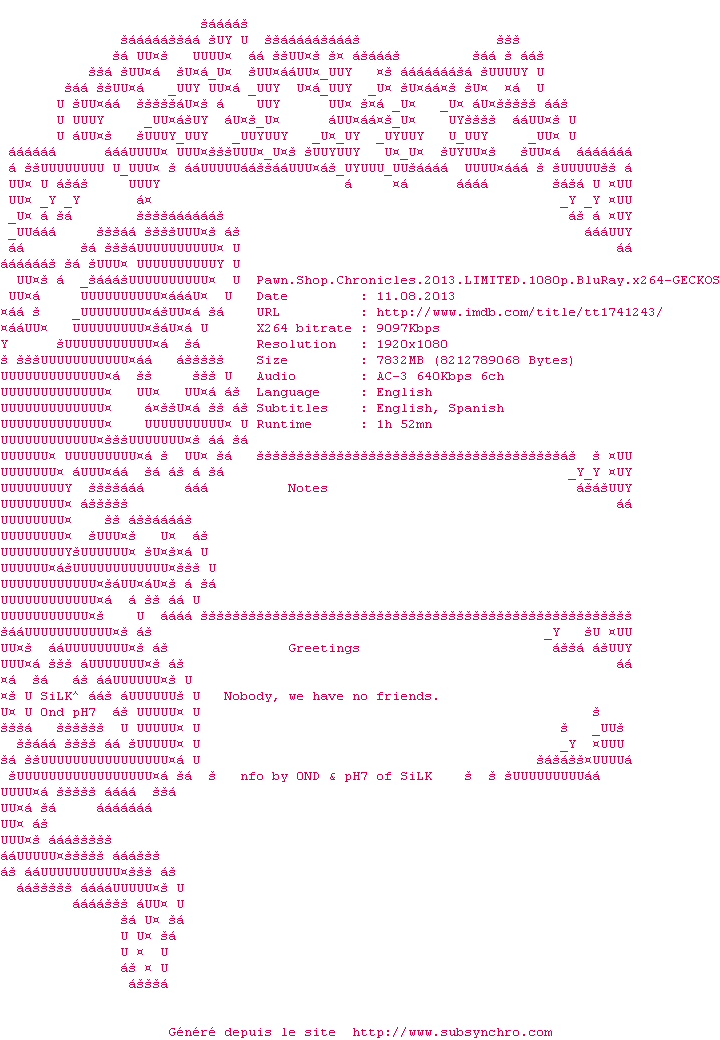 Voir le nfo de la release Pawn.Shop.Chronicles.2013.LIMITED.1080p.BluRay.x264-GECKOS