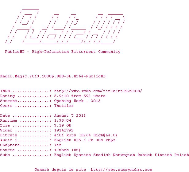 Voir le nfo de la release Magic.Magic.2013.1080p.WEB-DL.H264-PublicHD