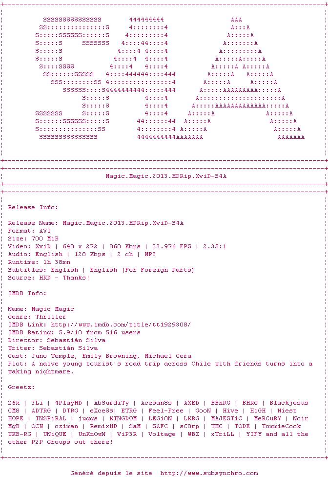 Voir le nfo de la release Magic.Magic.2013.HDRip.XviD-S4A