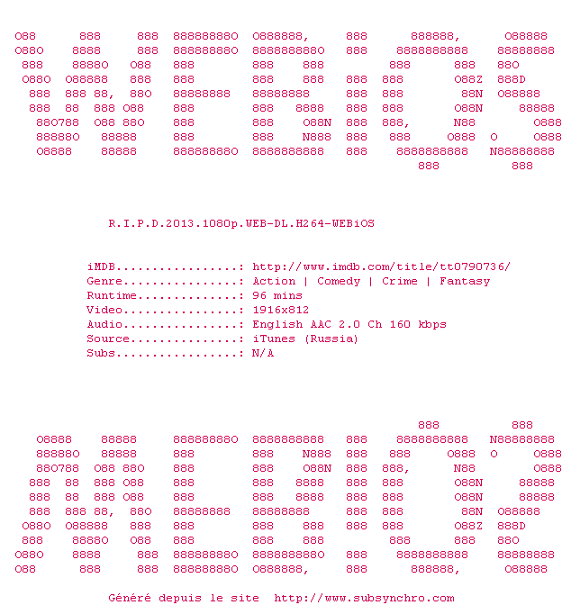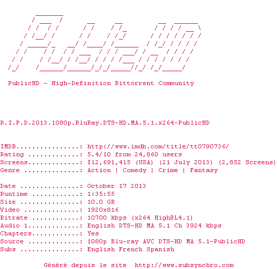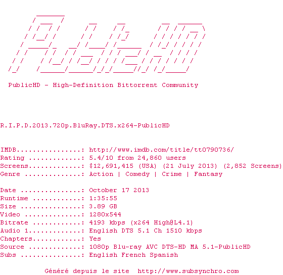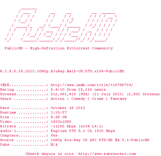 R.I.P.D est l'exemple type du film bas de gamme. Des gags affligeants, un "scénario" mille fois vu et rerevu qui désole par sa nullité et ses innombrables clichés, des acteurs qui en font des tonnes...La 3D est tout de même sympa et les effets spéciaux assez réussis, mais tout de même pas grand chose à sauver dans ce mauvais petit film qui essaie de se donner des allures de grand.