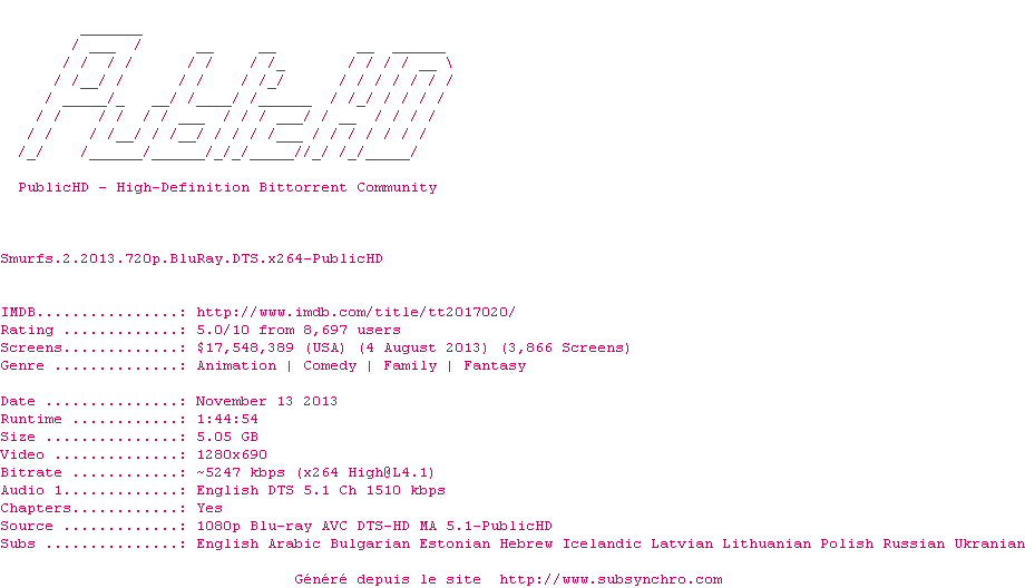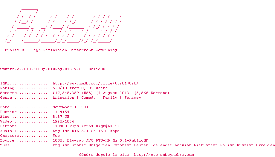Voir le nfo de la release Smurfs.2.2013.1080p.BluRay.DTS.x264-PublicHD