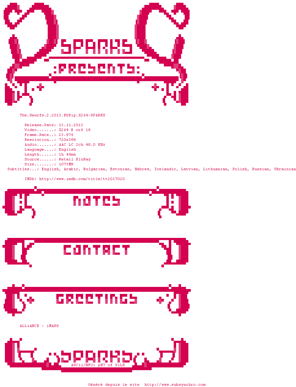 Voir le nfo de la release The.Smurfs.2.2013.720p.BluRay.x264-SPARKS
