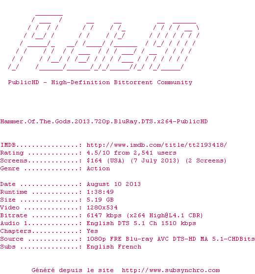 Voir le nfo de la release Hammer.Of.The.Gods.2013.720p.BluRay.DTS.x264-PublicHD
