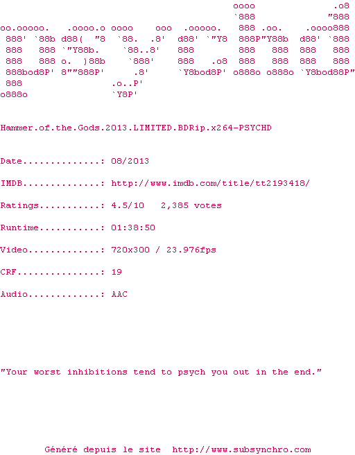 Voir le nfo de la release Hammer.of.the.Gods.2013.LIMITED.1080p.BluRay.x264-PSYCHD