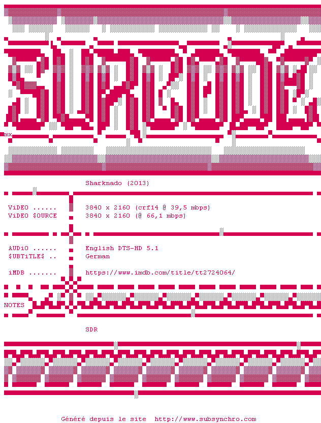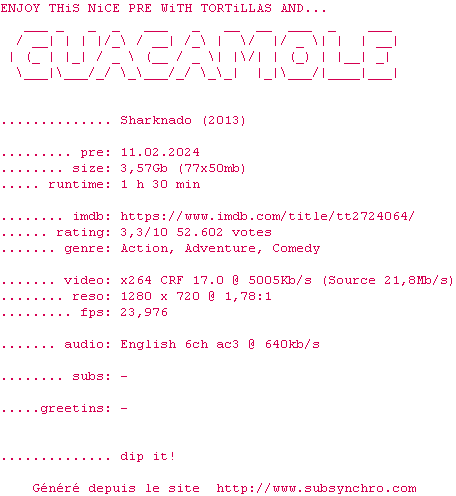 Le commentaire de CyberZip Commente par CyberZip (45), Le Samedi 09 Aout 2014 à 15h30 voir sharknado et ... mourir. Au même titre qu'aux USA il faut avoir vu "the room", le nanard improbable ultra buzzé, il a tant été dit de ce navet aux requins projetés par des tornades (NB : y a pire adaptation dans la série des requins tueurs, sandsharks, electroshark et j'en passe) qu'il est donc totalement obligatoire de le regarder entre potes pour se poiler avec chips et bière en main. Acteurs qqui ne croit pas une seconde en leur rôle, effet spéciaux digne d'un montage vidéo fait pour un projet de fin d'année scolaire, scène et scénario sous acide, tout y est et en +, y a une suite ! 0.5 / 10 0 0