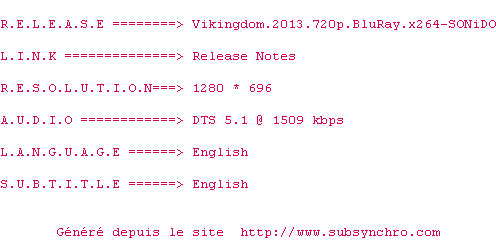 | Voir le nfo de la release Vikingdom.2013.720p.BluRay.x264-SONiDO | SONiDO | Vikingdom.2013.720p.BluRay.x264-SONiDO OpenSubtitles | 0 fichier | ||