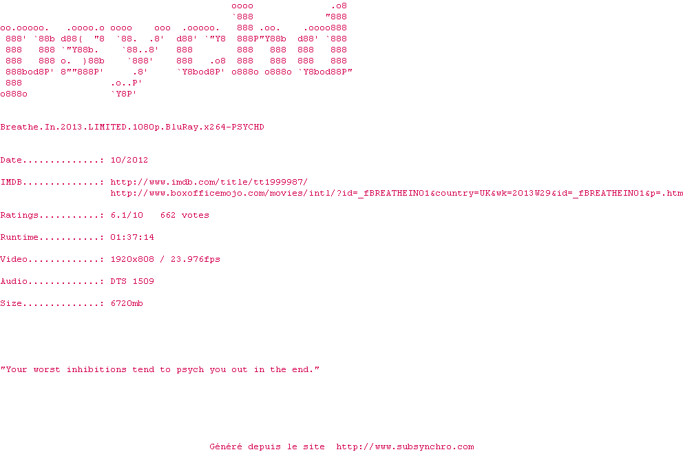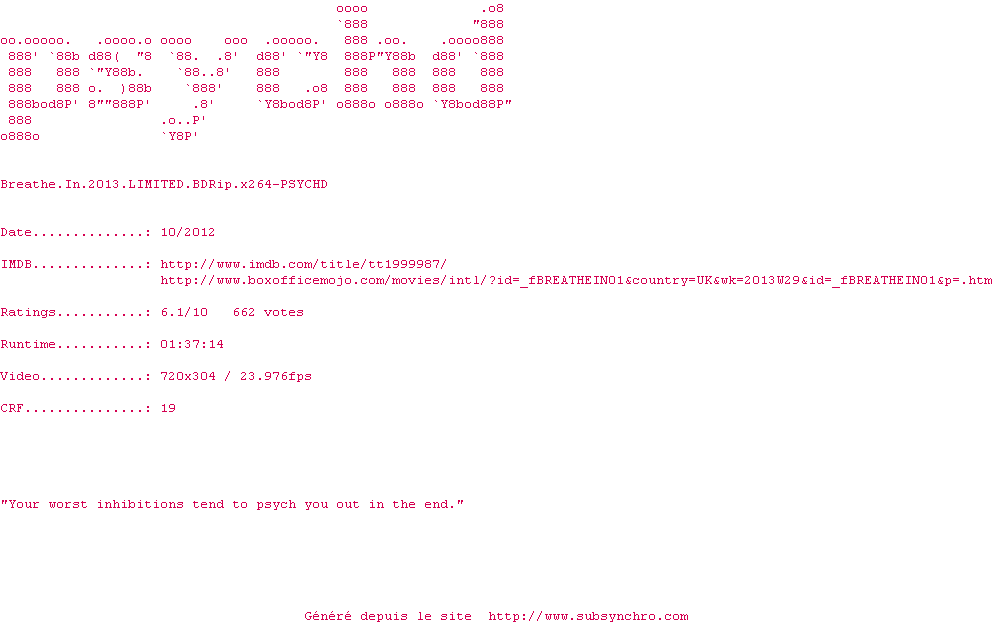 Voir le nfo de la release Breathe.In.2013.LIMITED.1080p.BluRay.x264-PSYCHD