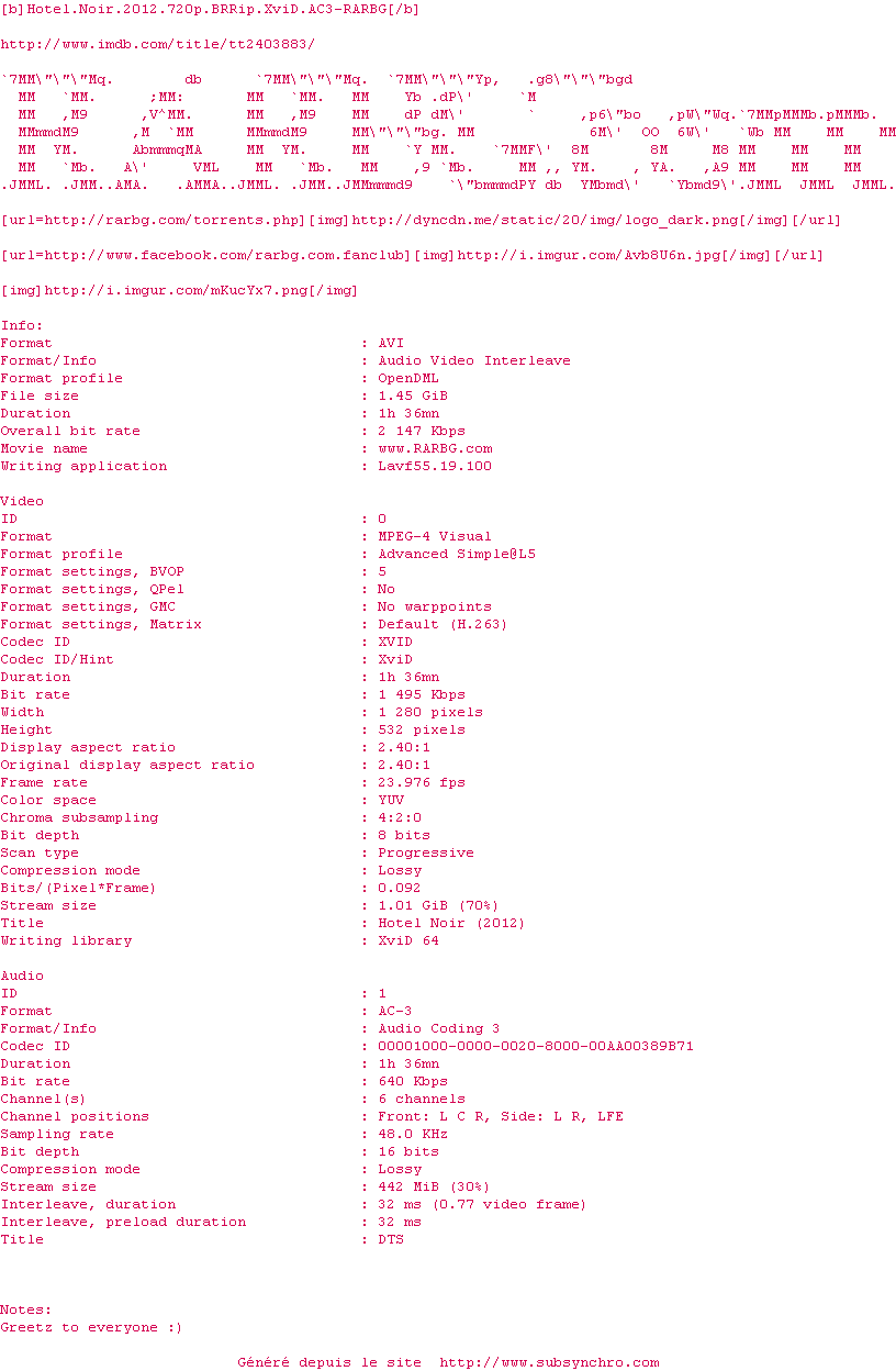 Voir le nfo de la release Hotel.Noir.2012.720p.BRRip.XviD.AC3-RARBG