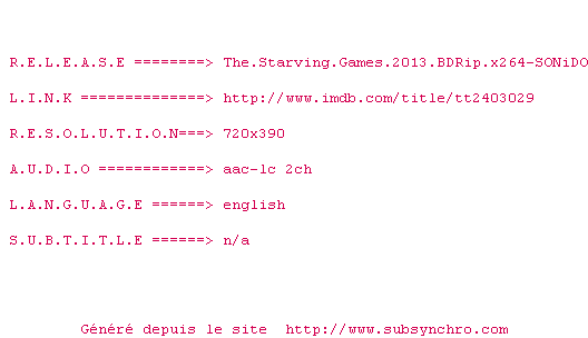Le commentaire de SubSynchro Commente par SubSynchro (343), Le Vendredi 20 Decembre 2013 à 09h24 Ce qui me choque le plus c'est que le mec qui a écrit le synopsis n'a apparemment pas vu le film. Ce film n'est ni plus ni moins une parodie de Hunger Games avec un petit clin d'oeil a certains films un peu à la "Ou est charlie ?". Bref, j'ai mis 4 pour l'effort mais seulement 1 gag sur 5 est efficace. A voir avec des pincettes et il faut bien connaitre Hunger Games 4 / 10 1 0