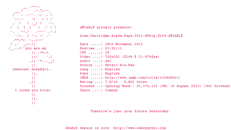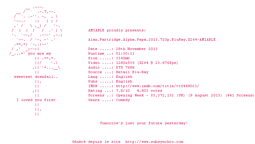 Voir le nfo de la release Alan.Partridge.Alpha.Papa.2013.1080p.BluRay.X264-AMIABLE