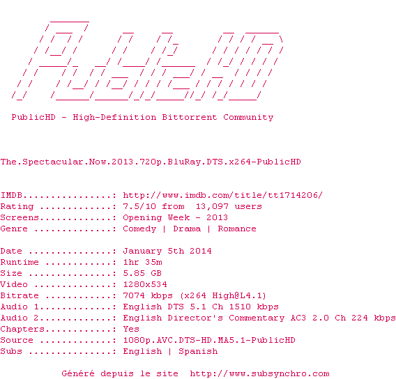 Voir le nfo de la release The.Spectacular.Now.2013.1080p.BluRay.DTS.x264-PublicHD