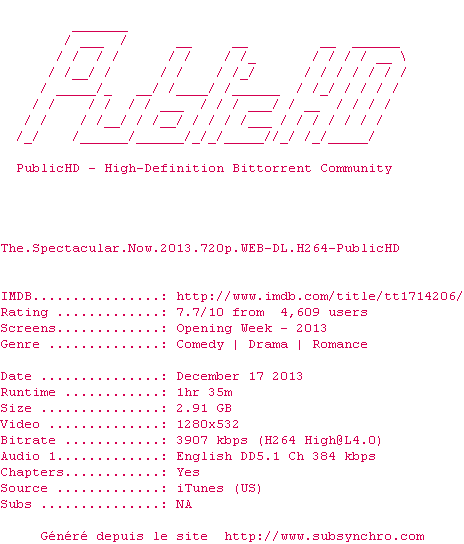 Voir le nfo de la release The.Spectacular.Now.2013.720p.WEB-DL.H264-PublicHD