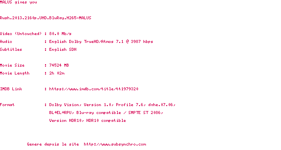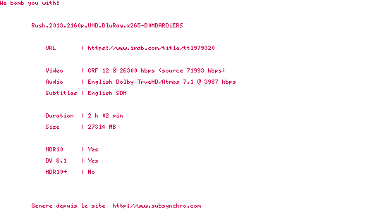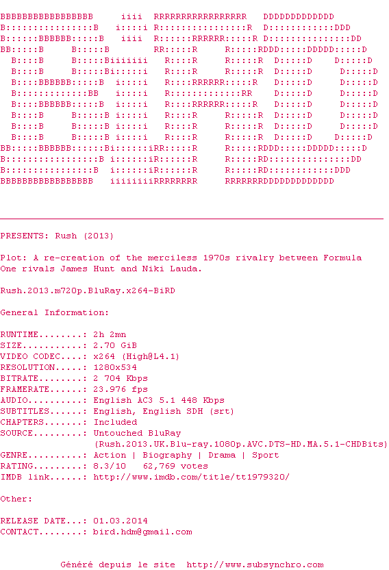 Le commentaire de Yavaro Commente par Yavaro (6), Le Samedi 04 Janvier 2014 à 17h27 Bluffé par ce biopic... Daniel Brühl en Niki Lauda est saisissant. Mon épouse (pas fan de F1 pourtant) et moi avons adoré ! A ne pas manquer... PS : Je confirme que pour les ST : pas de traduction entre la 15ème et la 18ème minute. Dommage (même si je comprends relativement bien l'anglais)... 10 / 10 1 0