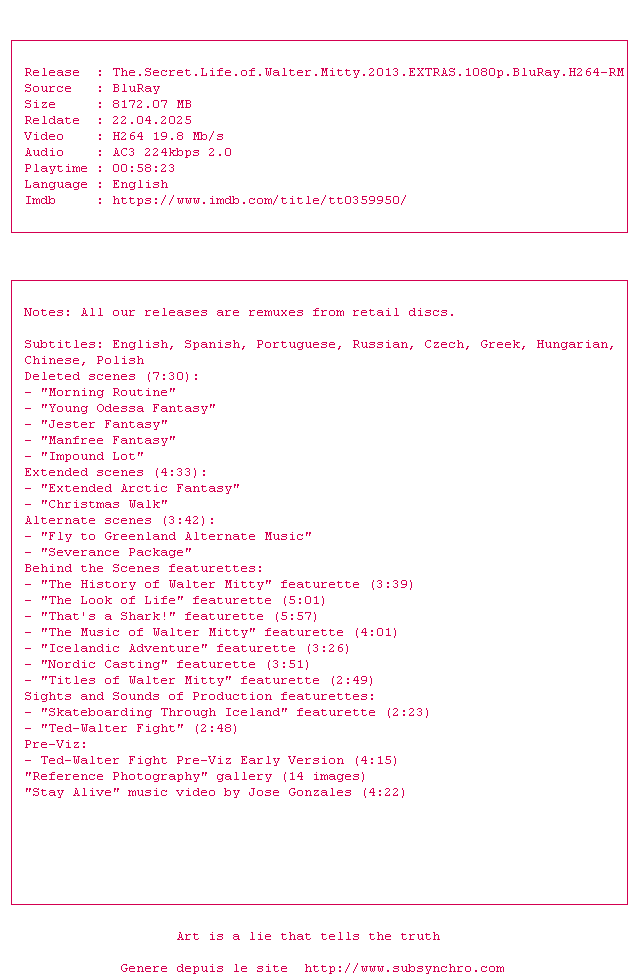Le commentaire de wooden Commente par wooden (26), Le Dimanche 23 Mars 2014 à 12h33 alors 30 minutes pour démarrer c'est la moyenne pour tout les BON films. 20min c'es trop tot , beaucoup trop tot.. bref pour ma part j'ai apprécier le début, lent mais en meme temps tres bien construit, avec des transitions très intéressantes et des rèves assez improbables! Je n'ai jamais vraiment appréciés les films de ben stiller mais j'ai particulièrement été surpris par celui ci. J'ai remarqué beaucoup plus de maturité, d'intelligence et de pronfondeurs.. C'est vraiment un beau film avec une belle morales, une histoire en crechendo et tout s’enchaîne parfaitement. 7.5 / 10 1 0