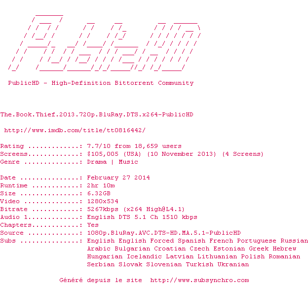 Voir le nfo de la release The.Book.Thief.2013.720p.BluRay.DTS.x264-PublicHD