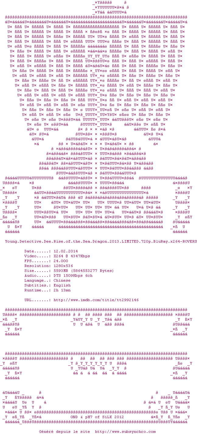 Voir le nfo de la release Young.Detective.Dee.Rise.of.the.Sea.Dragon.2013.LIMITED.BDRip.X264-ROVERS ROVERS Young.Detective.Dee.Rise.of.the.Sea.Dragon.2013.LIMITED.BDRip.X264-ROVERS OpenSubtitles 12/12/2014 Disponible en Z2 1 fichier