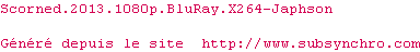 | Voir le nfo de la release Scorned.2013.1080p.BluRay.X264-Japhson | Japhson | Scorned.2013.1080p.BluRay.X264-Japhson OpenSubtitles | 0 fichier |