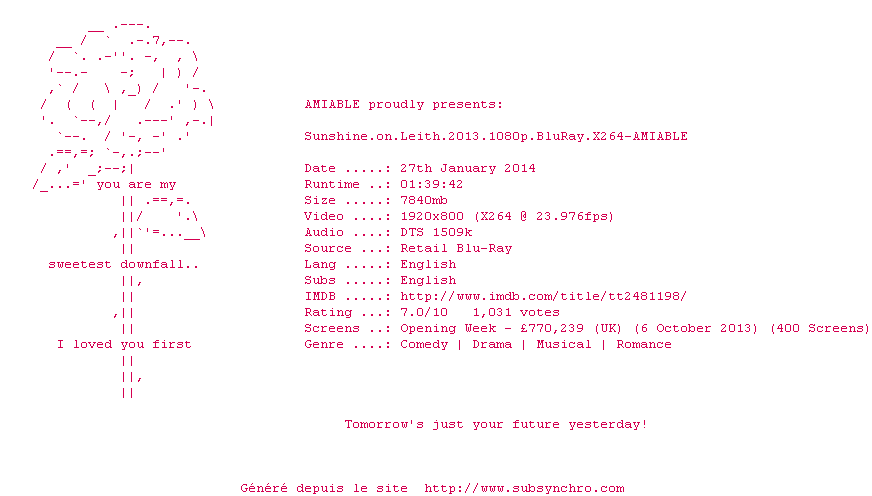 Voir le nfo de la release Sunshine.on.Leith.2013.1080p.BluRay.x264-AMIABLE