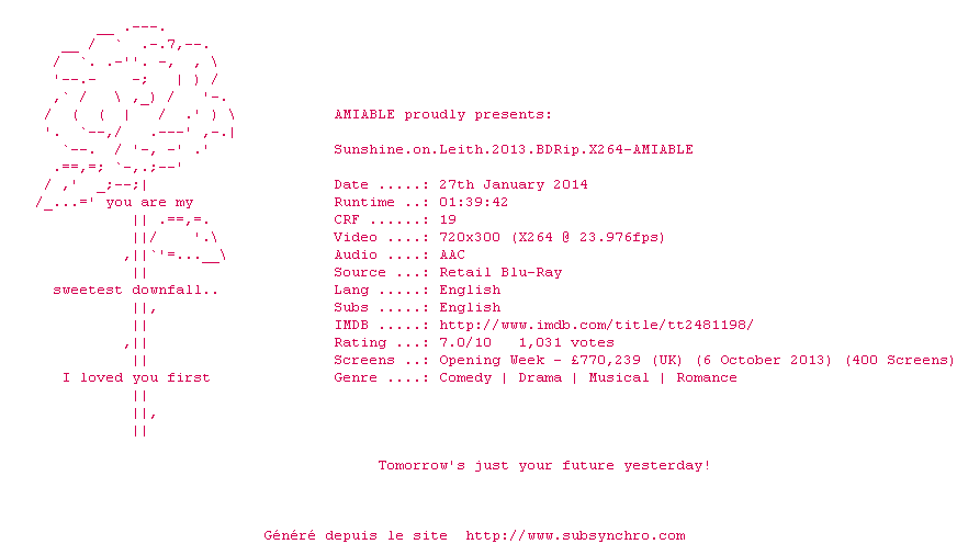 Voir le nfo de la release Sunshine.on.Leith.2013.BDRip.X264-AMIABLE