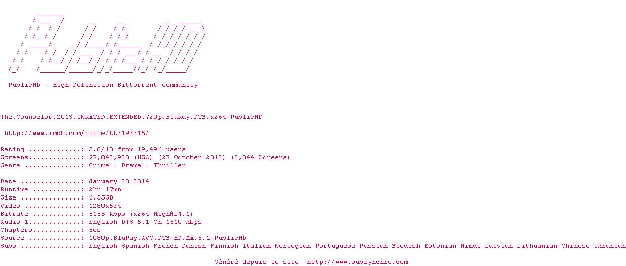 merci pour les sous-titres qui fonctionnent très bien.le film est insupportable de nullité.c'est du cache-misère du début à la fin, les acteurs grimacent et surjouent (cameron diaz plus que tous les autres, ça fait peine à voir, m'enfin ça n'a jamais été une grande comédienne), il n'y a pas un seul dialogue qui ne devienne prétexte à des digressions pompeuses et pédantes, quand ce n'est pas simplement incompréhensible, les plans et la mise en scène puent la sophistication à plein nez, tout est téléguidé et le scénario tiendrait à l'aise sur une serviette en papier de restau, où il a d'ailleurs probablement été écrit.mon ordi a planté pendant que je regardais le film et j’ai failli arrêter là , puis je me suis dit que j'allais boire le calice jusqu'à la lie pour pouvoir mettre en garde les amateurs de cinéma.autant revoir alien, blade runner ou à la riguer american gangster et kingdom of heaven et oublier très vite le dernier fiasco en date d'un réalisateur qui n'arrive plus à rien.