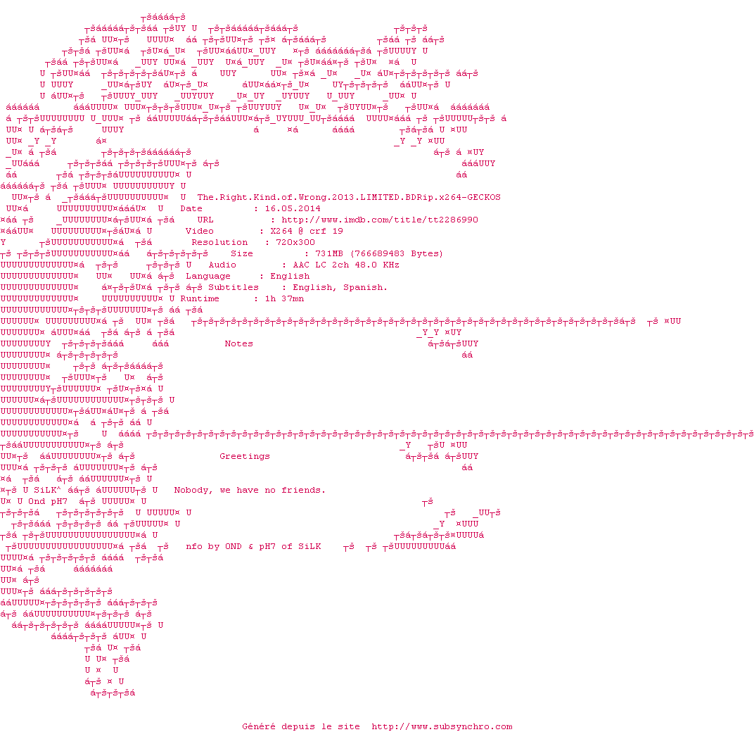 Voir le nfo de la release The.Right.Kind.of.Wrong.2013.LIMITED.720p.BluRay.x264-GECKOS