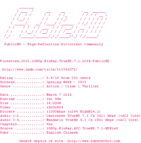 Voir le nfo de la release Firestorm.2013.1080p.BluRay.TrueHD.7.1.x264-PublicHD