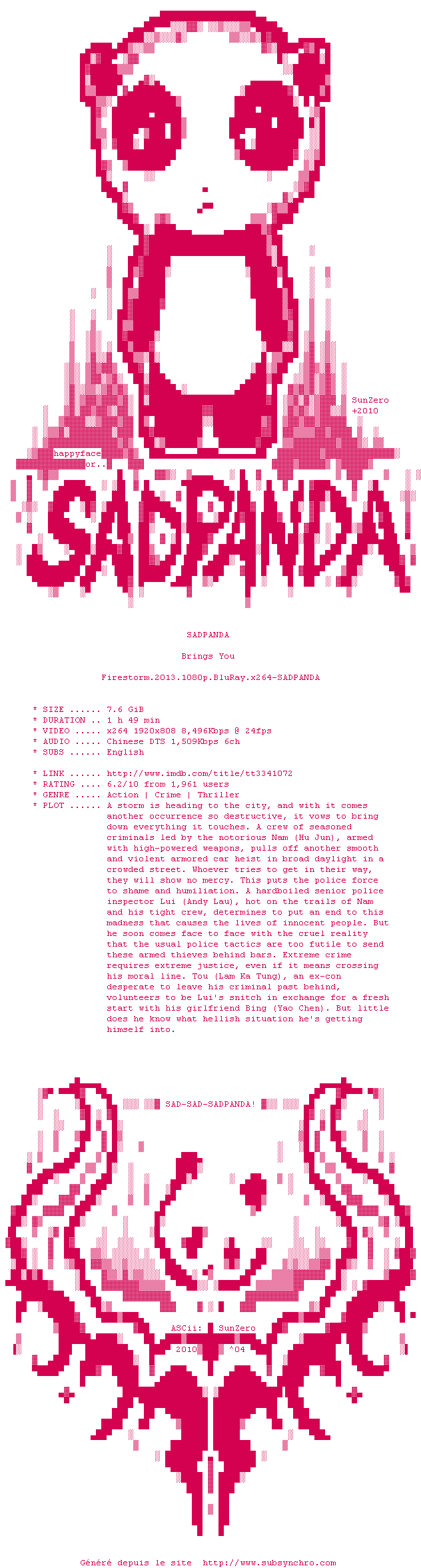 Voir le nfo de la release Firestorm.2013.1080p.BluRay.x264-SADPANDA