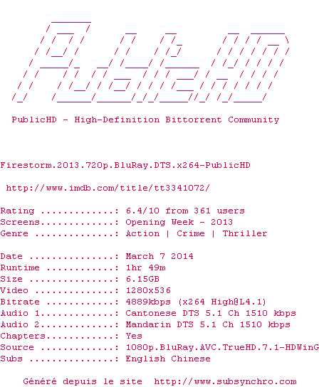 Voir le nfo de la release Firestorm.2013.720p.BluRay.DTS.x264-PublicHD