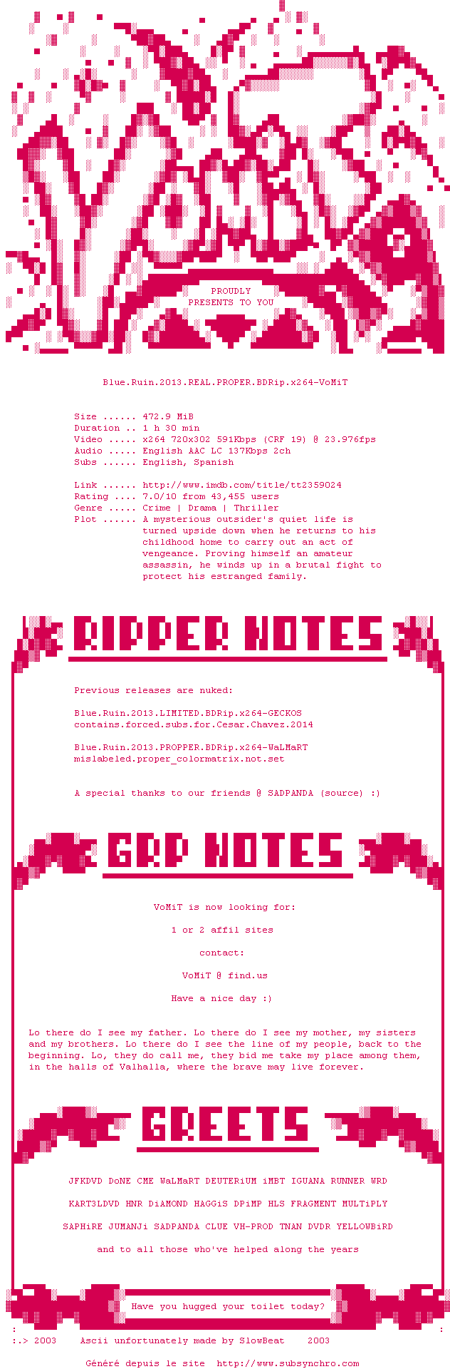 Voir le nfo de la release Blue.Ruin.2013.REAL.PROPER.BDRip.x264-VoMiT