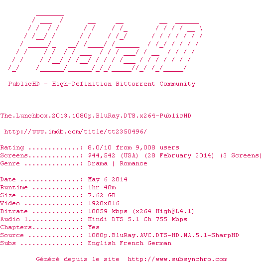 Voir le nfo de la release The.Lunchbox.2013.1080p.BluRay.DTS.x264-PublicHD
