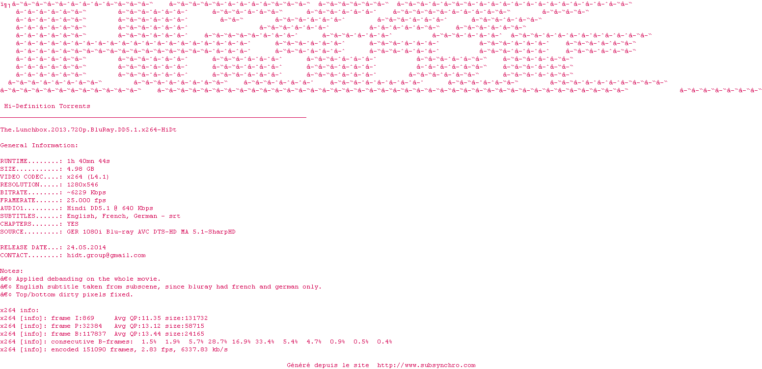 Voir le nfo de la release The.Lunchbox.2013.720p.BluRay.DD5.1.x264-HiDt