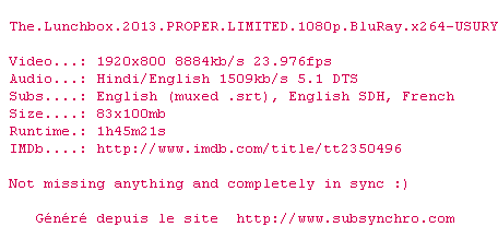 Voir le nfo de la release The.Lunchbox.2013.PROPER.LIMITED.1080p.BluRay.x264-USURY