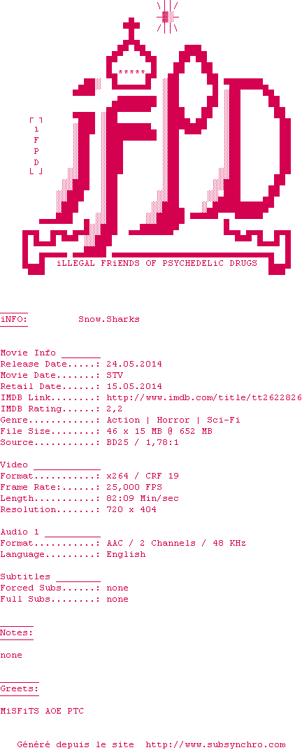 Voir le nfo de la release Avalanche.Sharks.2013.720p.BluRay.x264-iFPD