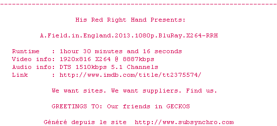 Fansub.srt Ajouté par Coquelicot Ajoute le 17-01-2014 01:01:25 Format : SRT Italique : Non Taille : 0.00Ko Telechargement : 52 Sous-titre « Fansub » Trad By Micou Ajouter cette release à ma collection en cas de telechargement des sous-titres 0 0 0 Telecharger le ZiP contenant NFO, Affiche, Sous-titre (*.srt) Commentez le fichier Fansub.srt Commentez le fichier Fansub.srt Commentez ce fichier Le fichier 10911-1389916885.srt n'existe pas ! Telechargez le RSS « Fichier de la release A.Field.in.England.2013.1080p.BluRay.X264-RRH » Retour a la release « A.Field.in.England.2013.1080p.BluRay.X264-RRH »
