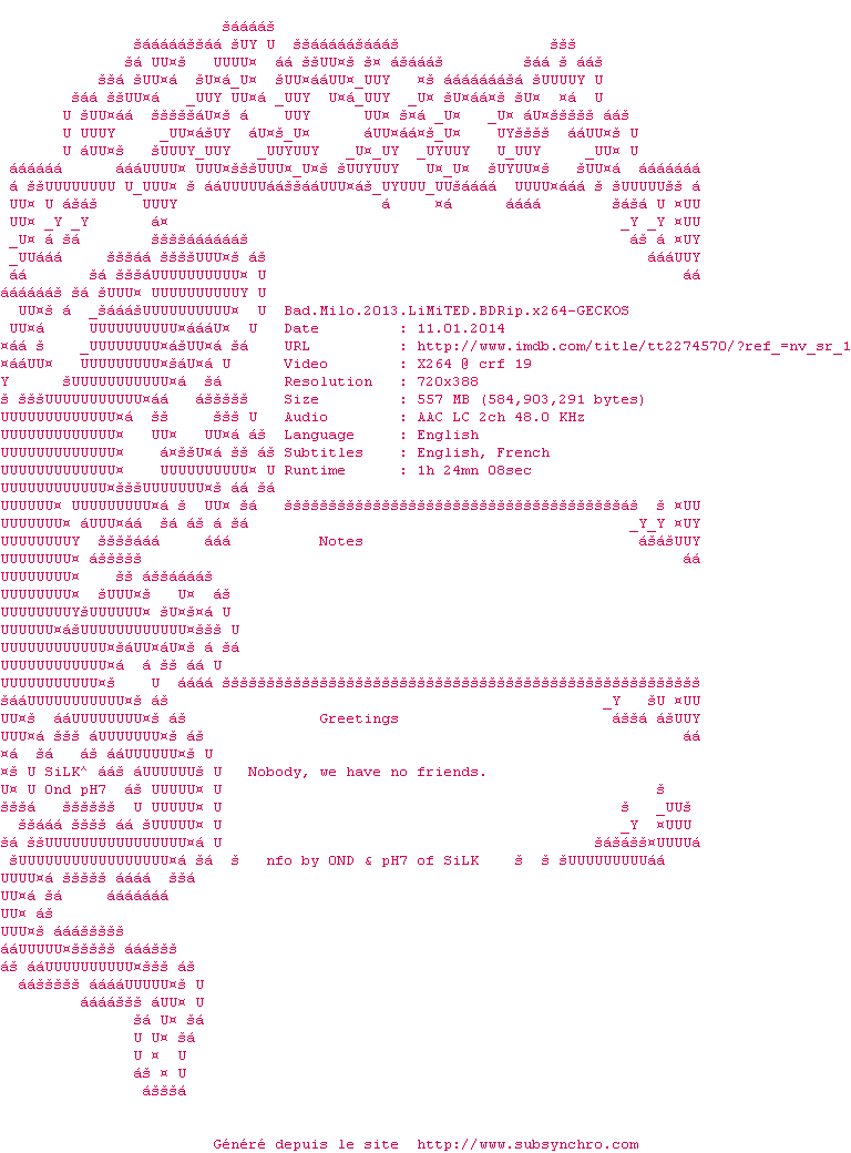 Telechargez le RSS « Fichier de la release Bad.Milo.2013.LiMiTED.BDRip.x264-GECKOS »